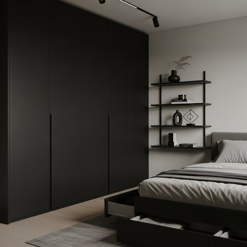 Storage is crucial in a minimalist dark bedroom to avoid clutter. Opt for built-in wardrobes, under-bed storage, or streamlined shelves that blend seamlessly with the room’s color scheme. Closed storage maintains a clean, sleek appearance while hidden compartments keep essentials organized. Minimal accessories on top of storage surfaces prevent visual noise. Efficient storage allows the room to remain functional and stylish.