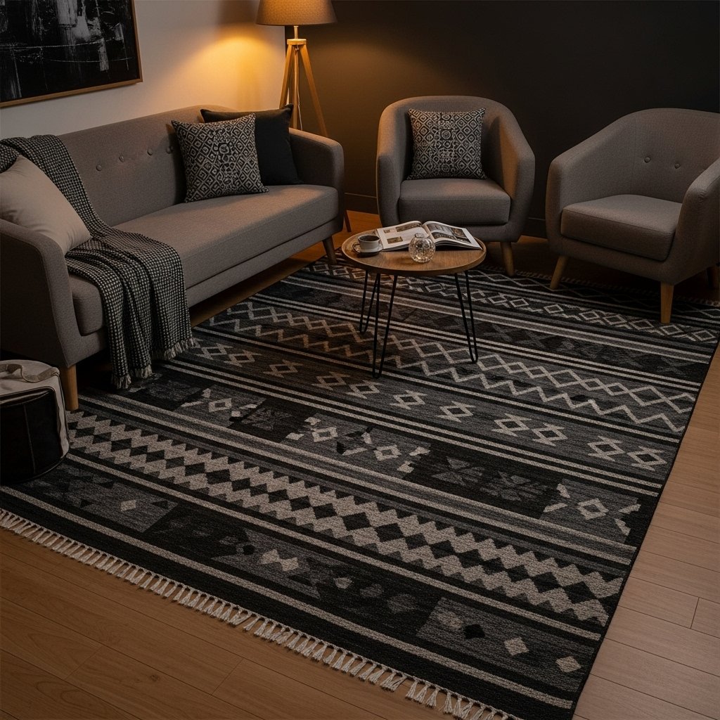 A statement rug can anchor the room and add both texture and visual interest. Dark patterned rugs, natural fibers, or monochrome designs complement a minimalist dark palette. Placing the rug under the bed or seating area defines the space while keeping it cozy. Rugs also soften hard flooring and contribute to a comfortable, inviting environment. This simple addition adds depth without breaking the minimalist aesthetic.