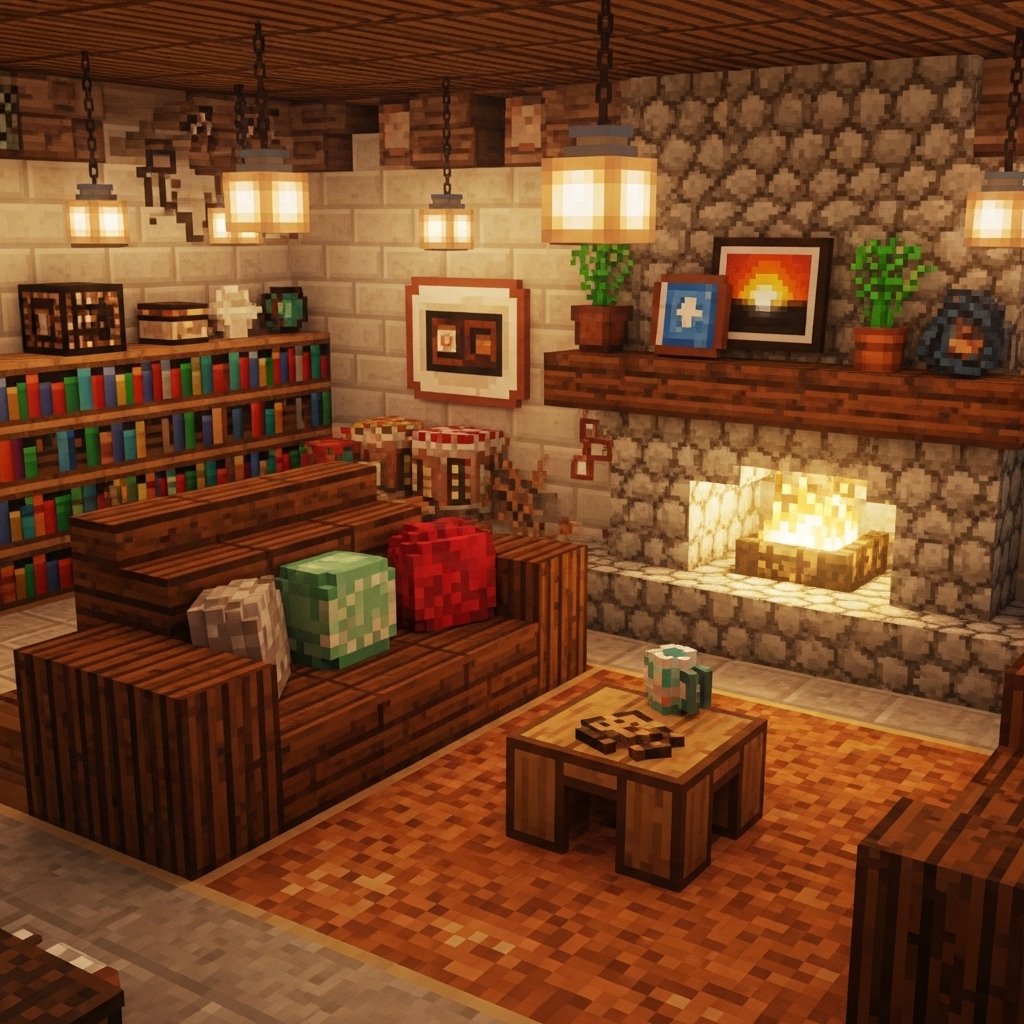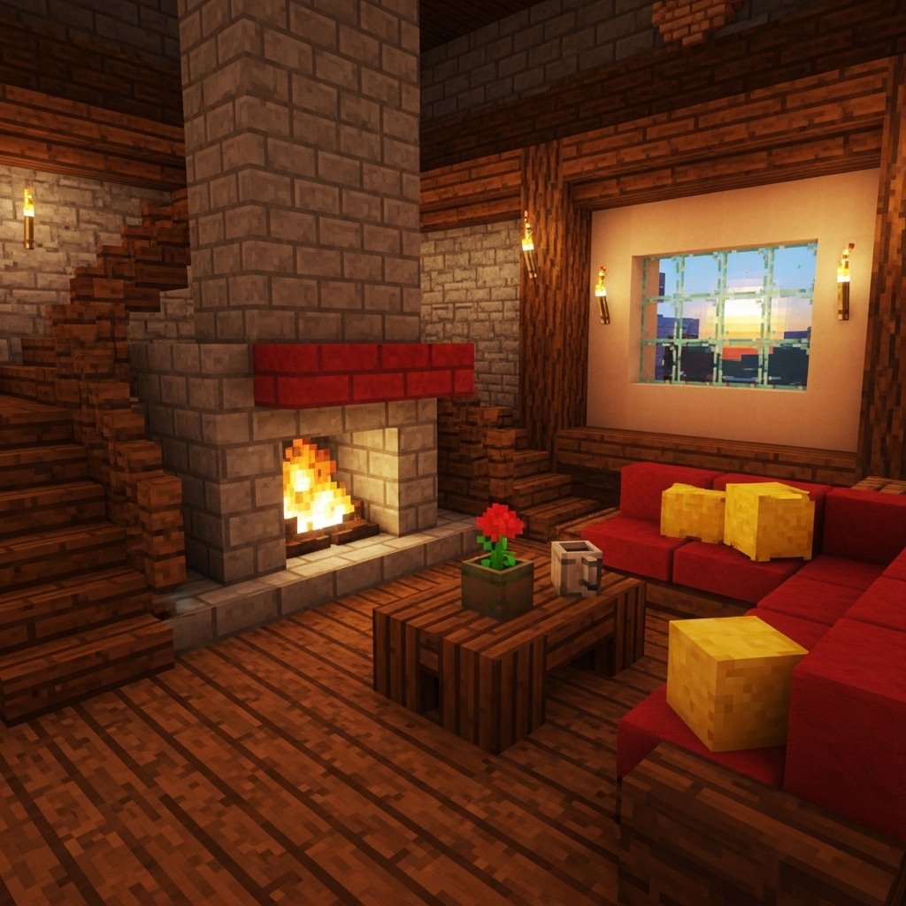 A cozy living room is essential for making your Minecraft home feel warm and inviting. Use stairs and slabs to create sofas, and place carpets for a soft flooring effect. Adding a fireplace using bricks or stone blocks instantly elevates the atmosphere. Lanterns or glowstone provide soft lighting that enhances the cozy vibe. This setup works perfectly for relaxing areas in both small and large builds.