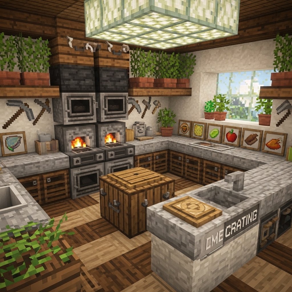 Creating a functional kitchen adds realism and utility to your Minecraft interior decor. Use furnaces as ovens and smokers for cooking stations. Trapdoors and slabs can be arranged to resemble cabinets and countertops. Item frames with food items help give the kitchen a lively and realistic touch. This design is perfect for players who enjoy roleplaying or immersive gameplay.