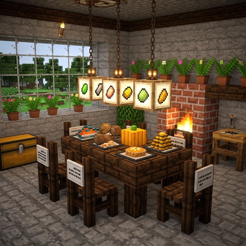 A dedicated dining area adds a realistic touch to your home. Use fences and pressure plates or trapdoors to create tables and chairs. Decorate the table with items like cakes or food placed in item frames. Add lighting above the table to highlight the space. This area works well for roleplay and enhances the overall interior design.