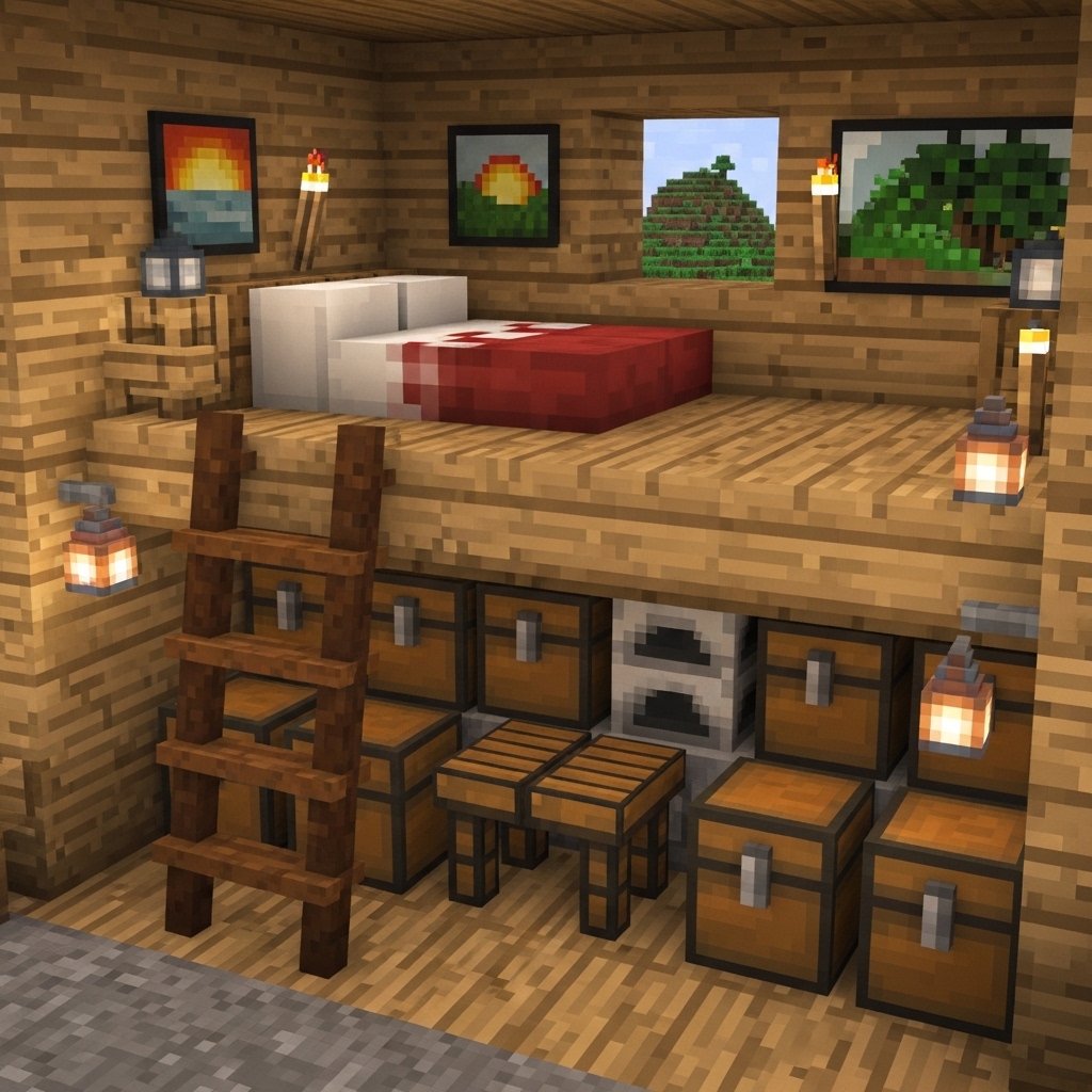 A loft bedroom is a perfect solution for maximizing vertical space in a small Minecraft house. Build a raised platform using slabs or stairs and place your bed on top. This leaves the area below free for storage or crafting stations. Adding ladders or trapdoors enhances the compact design while keeping it accessible. This idea creates a cozy sleeping area without taking up valuable floor space.