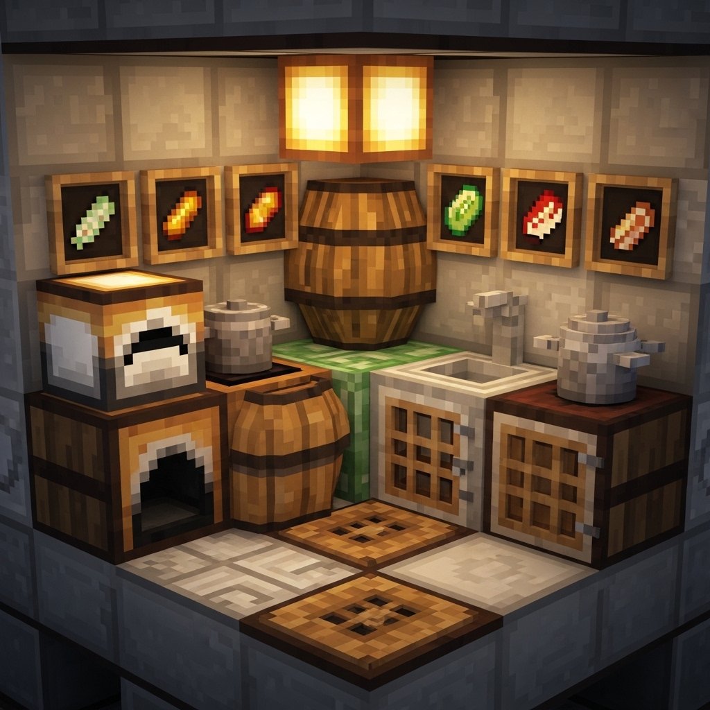 Even in a small Minecraft house, you can design a functional kitchen. Use furnaces as stoves, smokers for cooking, and barrels as cabinets. Add trapdoors or slabs to create countertops and a realistic layout. Placing item frames with food items enhances the kitchen theme. This setup brings realism and utility to your interior design.