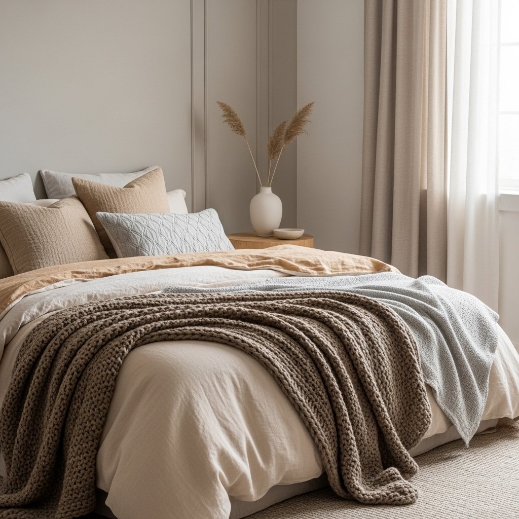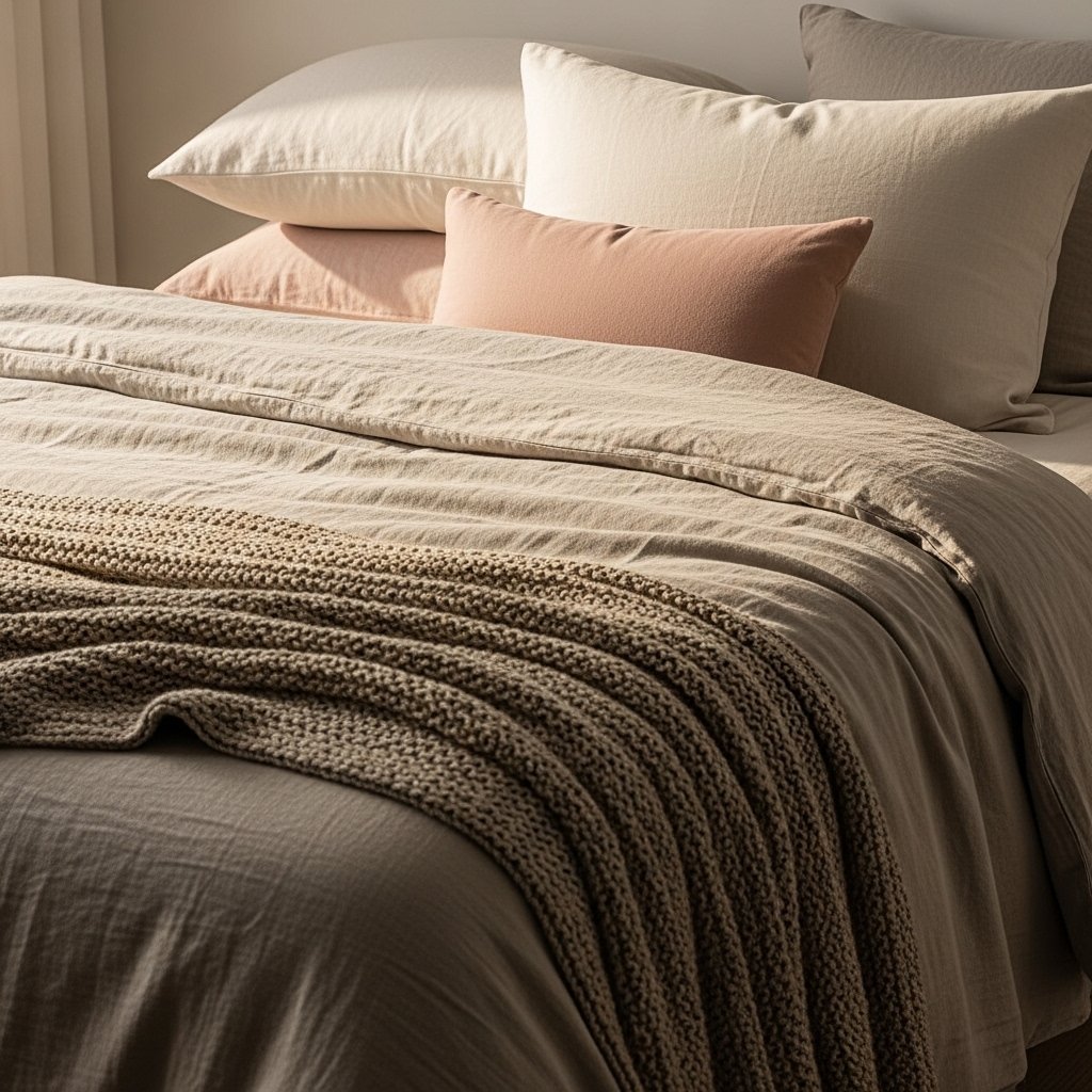 Layered bedding brings warmth and comfort into a minimalist bedroom without overwhelming the design. Start with high-quality neutral sheets and add a textured duvet or comforter in soft tones. Incorporate knitted throws, linen blankets, or lightweight quilts for depth and coziness. Limiting the color scheme while varying textures creates visual interest without clutter. The result is a bed that feels inviting, feminine, and perfectly styled.