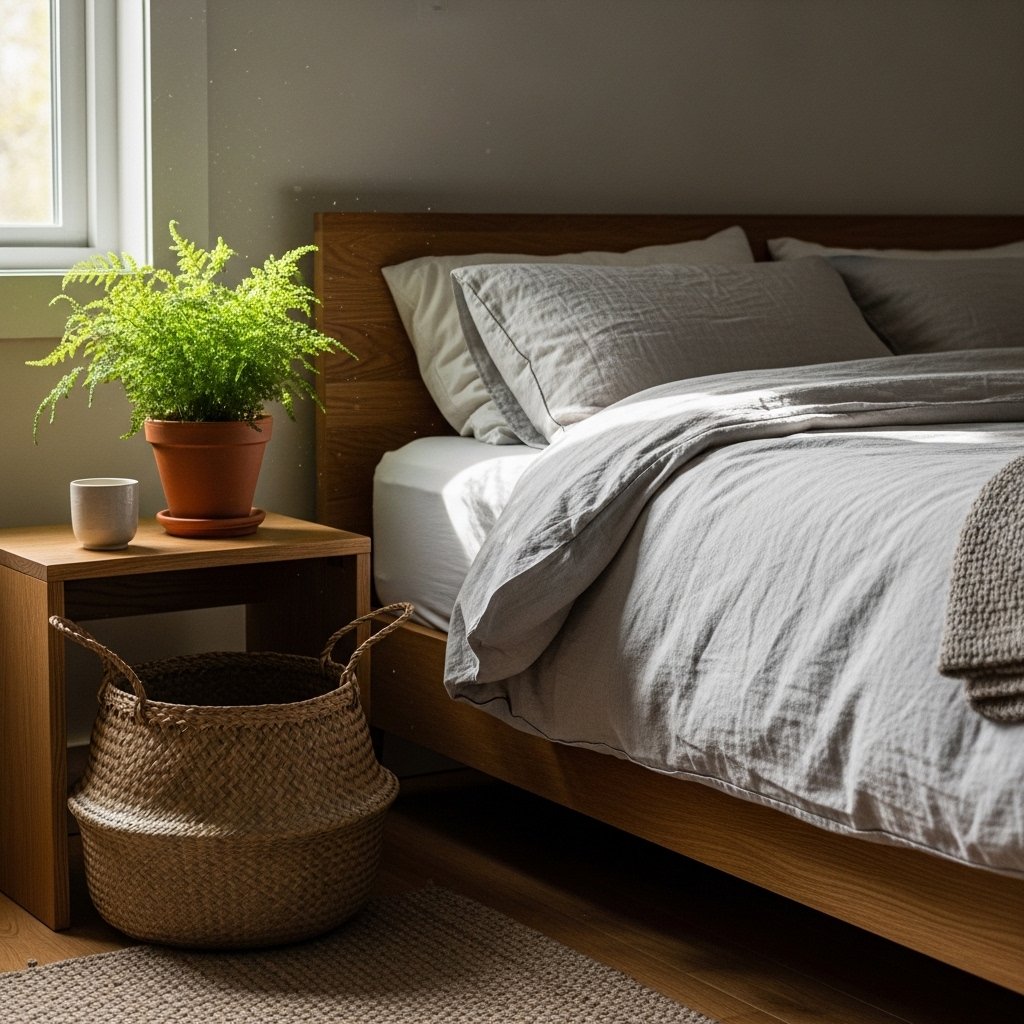 Natural elements add warmth and grounding energy to minimalist bedroom ideas for small rooms women cozy. Wooden accents, woven baskets, or linen textiles introduce texture without clutter. Small indoor plants can bring life and softness into the space while improving air quality. Natural materials create harmony and a calm environment. These details make the room feel balanced and inviting.