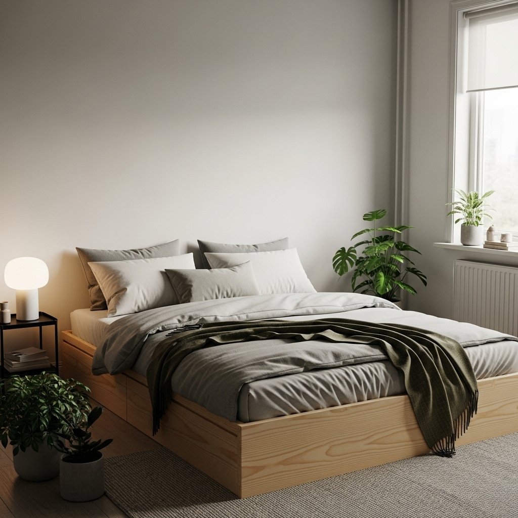 Low-profile bed frames are ideal for minimalist bedroom ideas in small rooms because they create the illusion of higher ceilings. Platform beds or simple wooden frames keep the look clean and grounded without bulky headboards. This style enhances openness while still feeling modern and sophisticated. Pair the frame with soft bedding to maintain that cozy feminine aesthetic. A streamlined bed design also leaves more visual space for other essentials in the room.