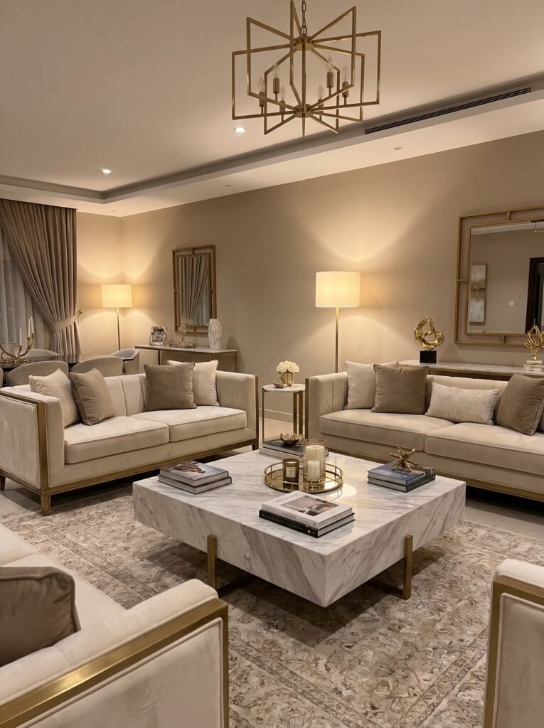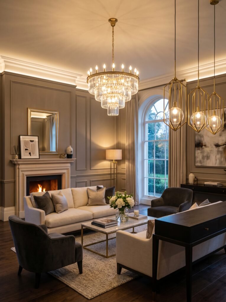 Lighting plays a crucial role in setting the tone of the living room. Choose chandeliers or pendant lights with a classic design but modern finishes. Metallic accents like gold or brushed brass add a touch of luxury. Layered lighting, including floor lamps and wall sconces, creates a warm ambiance. Proper lighting enhances both functionality and style.
