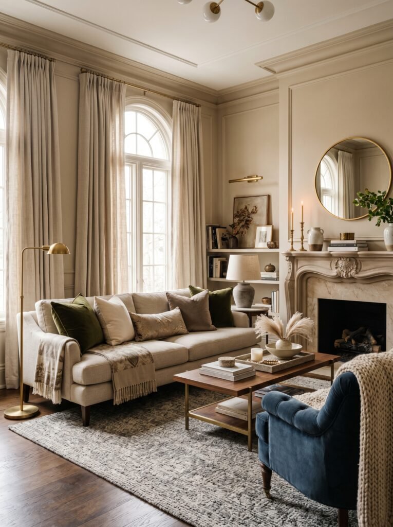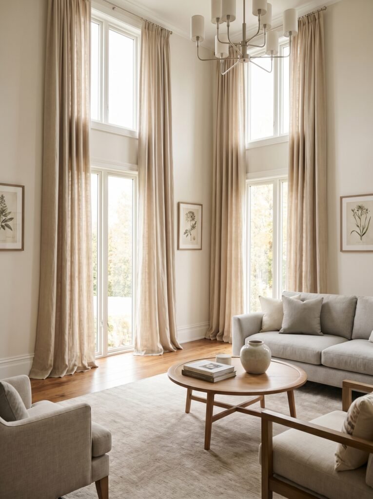 Long, flowing curtains add drama and elegance to the living room. Choose fabrics like linen or velvet in neutral or soft tones. Floor-to-ceiling curtains make the space appear larger and more refined. They also enhance natural light while providing privacy. This simple addition can transform the overall look of the room.