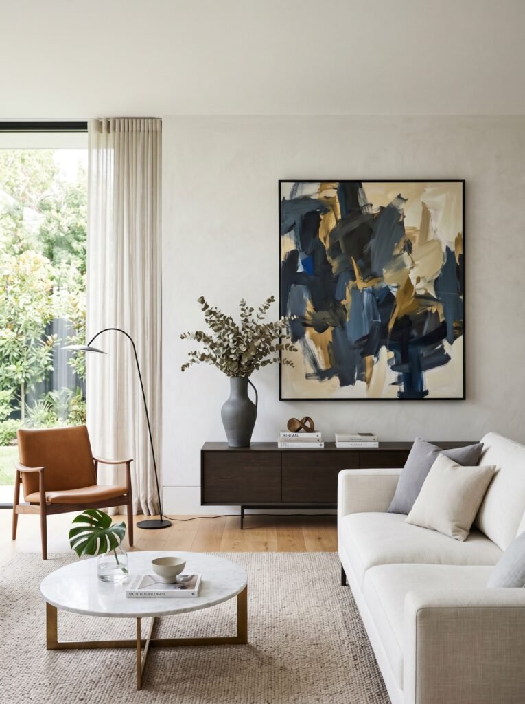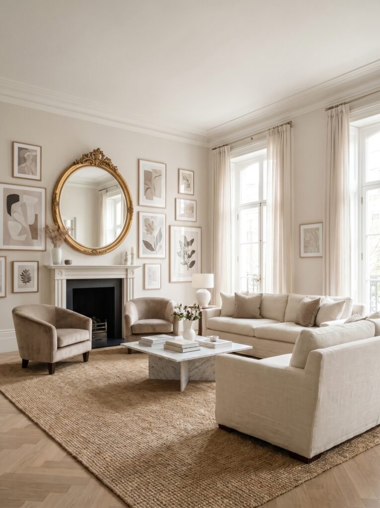 Artwork and mirrors are essential for completing a modern classic interior. Choose pieces that reflect your personality while maintaining a cohesive style. Large mirrors can make the room feel more spacious and bright. Classic frames with modern art create an interesting contrast. These elements add the finishing touch to your living room design.