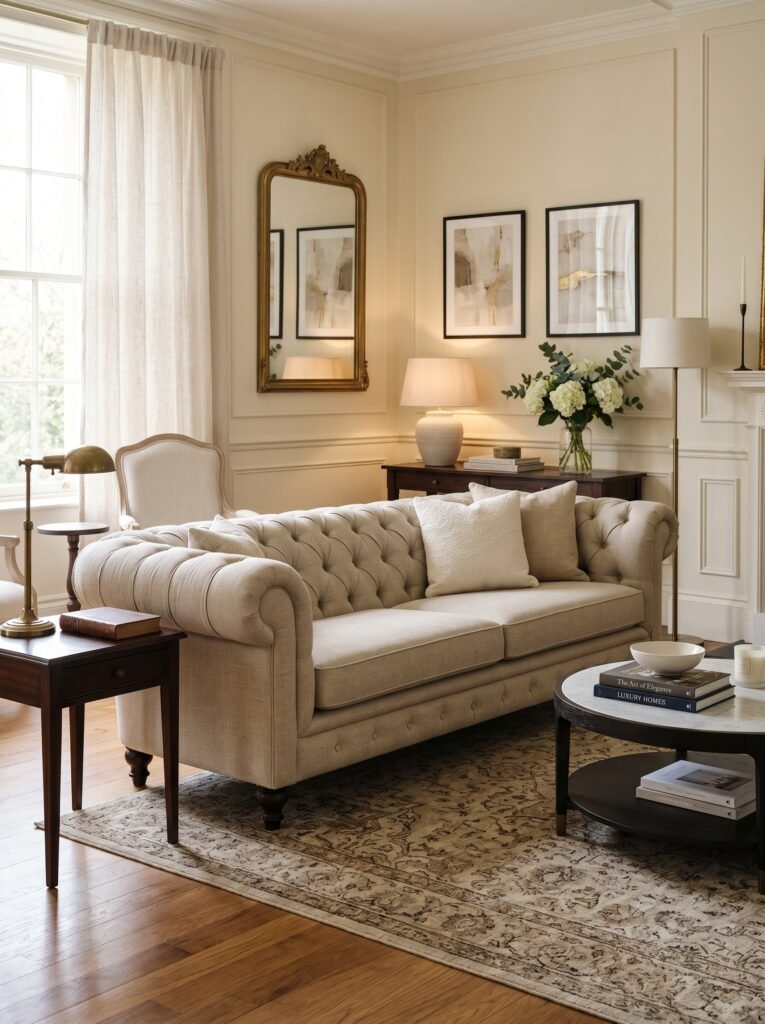 A statement sofa with a classic silhouette is the centerpiece of this design style. Look for tufted designs, rolled arms, or structured shapes that reflect traditional elegance. Upholstery in neutral tones or soft pastels enhances the modern classic feel. Pair the sofa with minimalistic cushions to keep the look balanced. This combination ensures both comfort and sophistication in your living room.