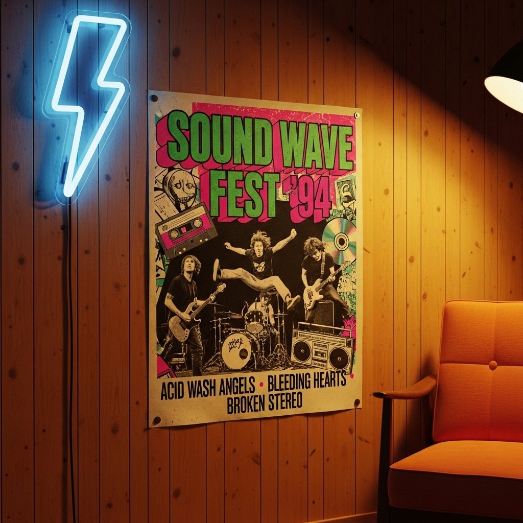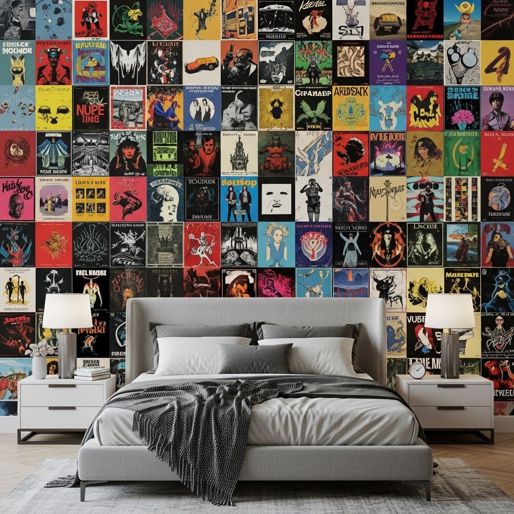 Retro 90s posters featuring cassette art, grunge bands, and vintage concerts create a throwback vibe. Neon accents and checkerboard patterns enhance the nostalgic feeling. Slightly angled placement adds authenticity rather than perfect alignment. This works great with warm lighting and retro furniture pieces. The room instantly feels energetic and expressive.