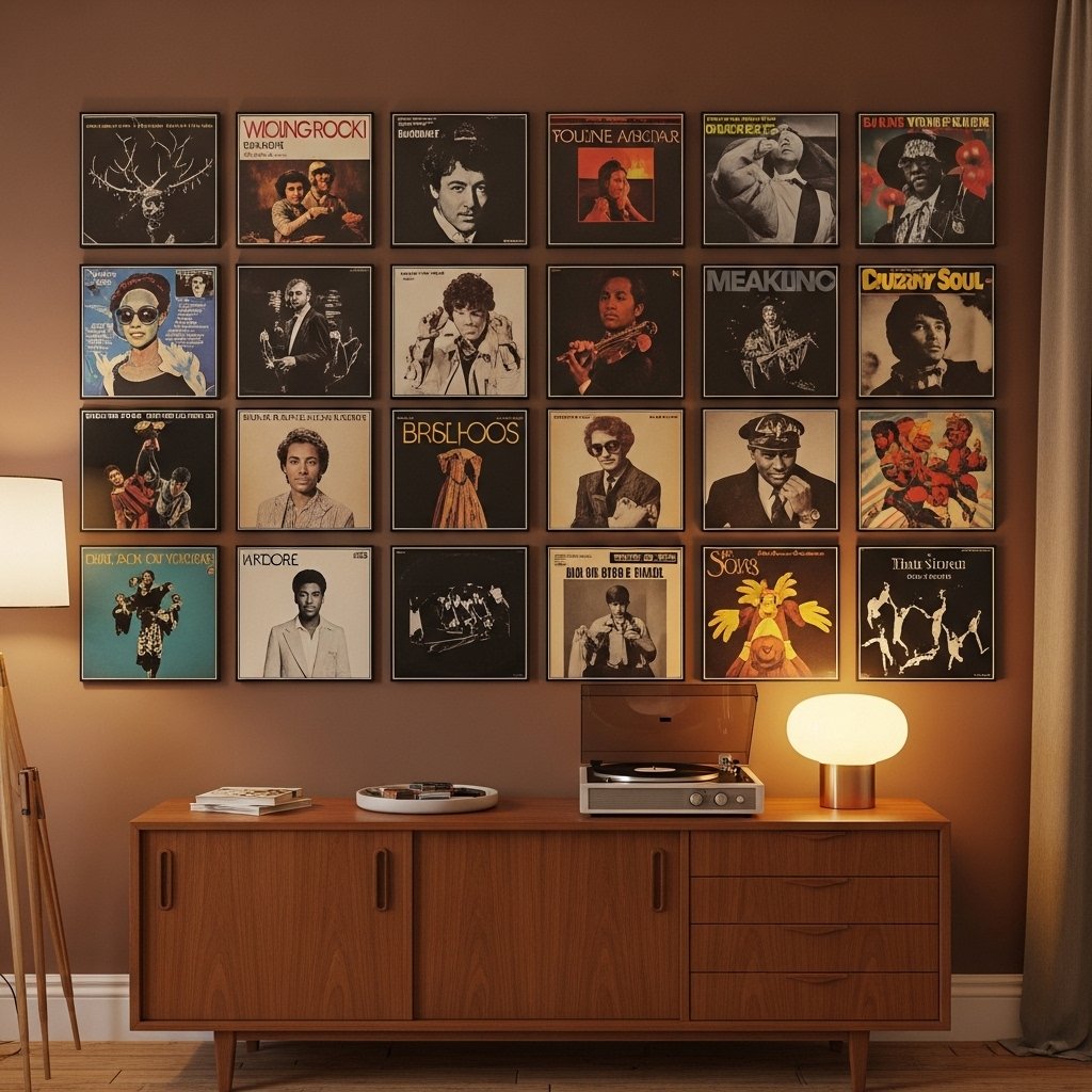 A vinyl album cover gallery wall creates a nostalgic and artistic atmosphere perfect for music lovers. Arrange classic records in neat grids or slightly uneven patterns for a relaxed aesthetic feel. Black, brown, and beige tones work especially well for vintage rock and jazz themes. Use thin frames or clear sleeves to keep the covers protected while showing artwork clearly. This idea turns your favorite albums into timeless wall art rather than simple decoration.