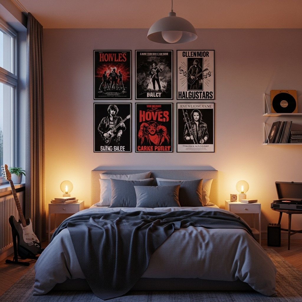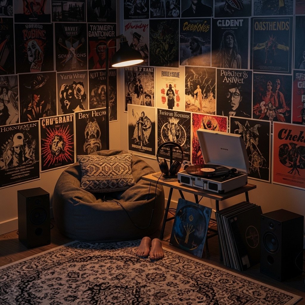 Design a dedicated listening corner with posters surrounding a chair or bean bag. Place headphones, speakers, or a record player near the wall to define the space. Posters should wrap slightly around both sides of the corner for immersion. Soft lamps and rugs enhance comfort and relaxation. This turns a small section of the room into a personal music retreat.
