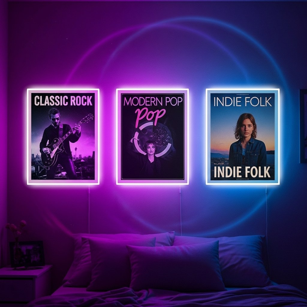 Adding LED strip lights around music posters instantly creates a glowing aesthetic atmosphere. Warm white lights give a cozy vibe while purple or blue lights create a dreamy bedroom environment. Position lights behind posters or around the border of the wall for depth. This style is extremely popular for night-time mood lighting and social media backgrounds. The combination of music art and soft lighting makes the room feel immersive and relaxing.