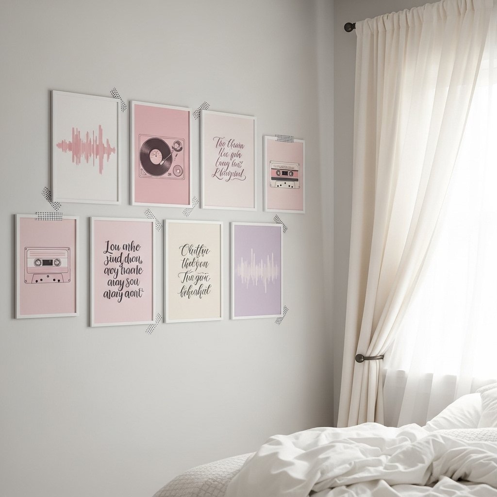 A lyric quote wall highlights meaningful song lines that connect emotionally with the listener. Use mixed typography posters featuring handwritten fonts and simple serif text styles. Neutral or pastel backgrounds help keep the focus on the words rather than heavy imagery. This style works beautifully in study corners or reading spaces. It creates a calm environment where music and emotions blend together.