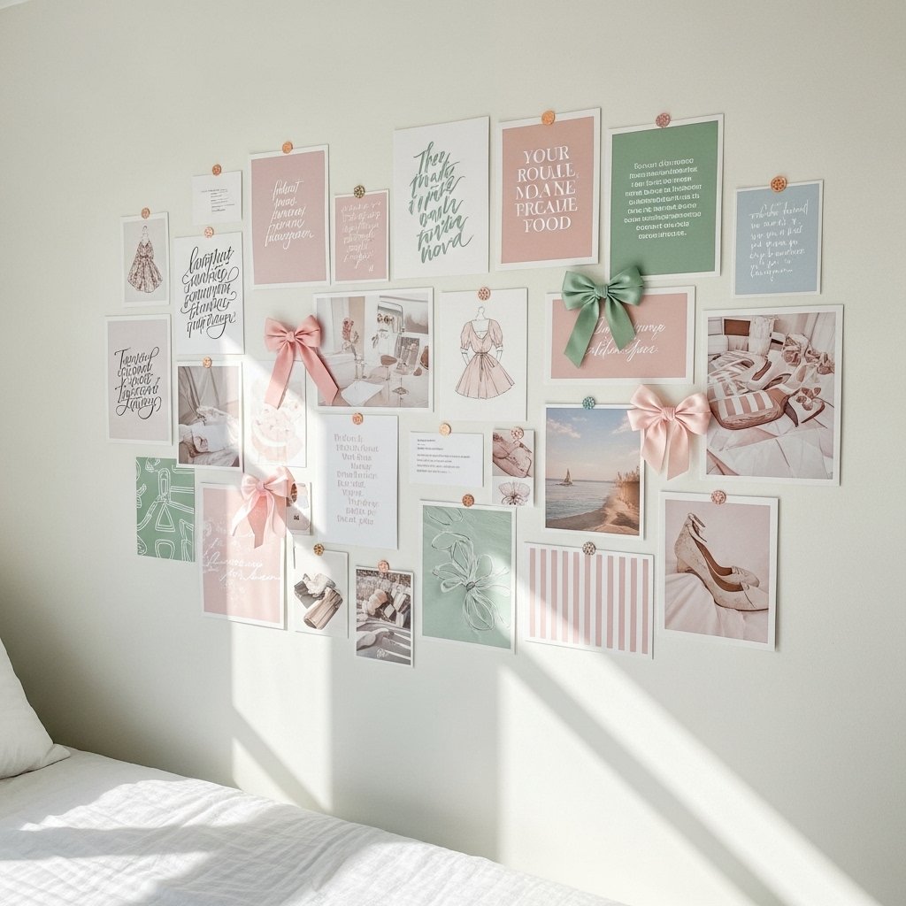 A preppy paper wall collage is one of the most popular DIY room decor ideas. You can use printed quotes, pastel graphics, fashion sketches, and aesthetic photos to create a cohesive look. Arrange the papers in a grid or scattered layout to match your personal style. Soft pinks, blues, greens, and neutrals work best for a classic preppy vibe. This decor instantly transforms blank walls into stylish focal points.