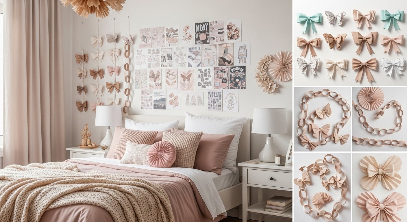 Preppy room decor ideas using DIY paper focus on clean, colorful, and stylish designs made with simple paper materials. These ideas often include paper wall art, cute quotes, bows, hearts, flowers, and pastel-themed decorations. DIY paper decor helps create a neat and cheerful room look while keeping the style fresh, trendy, and well-organized.