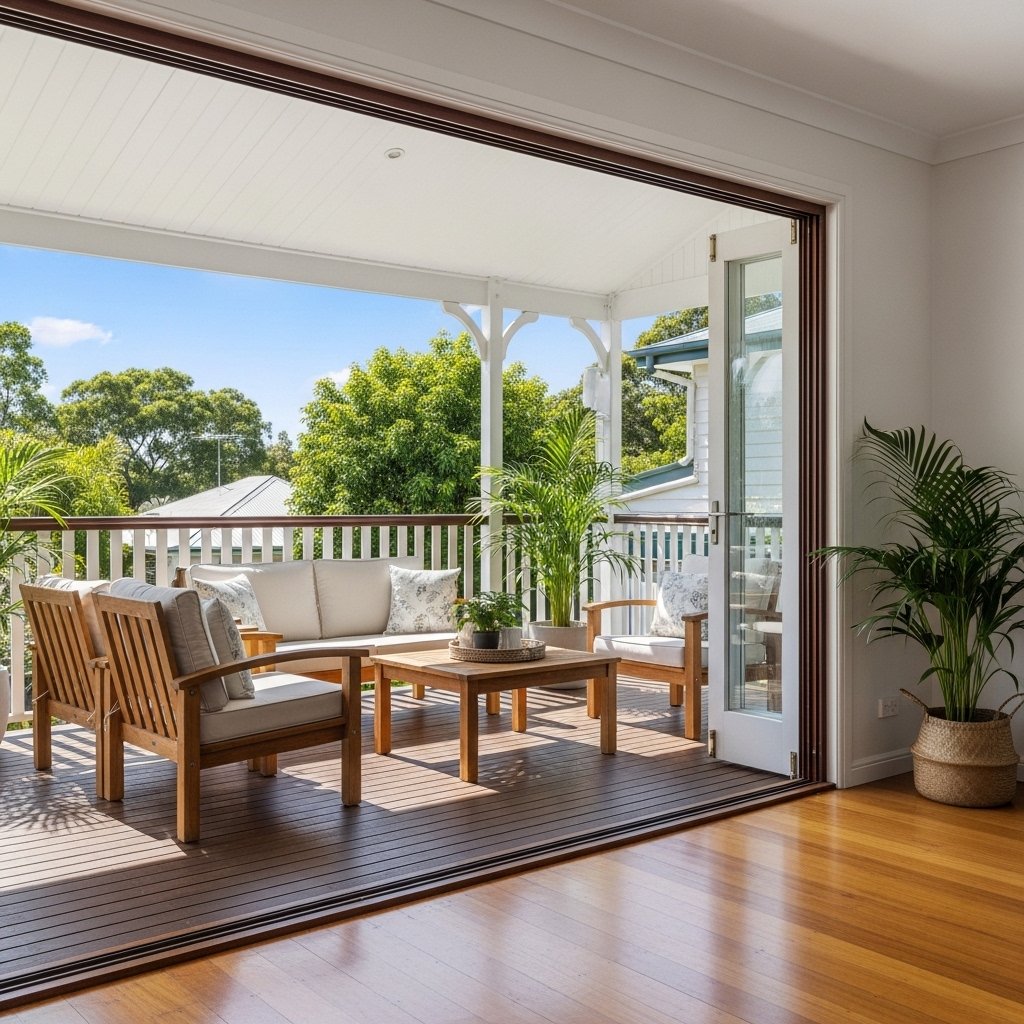 Queenslander homes are famous for their wide verandas that seamlessly connect indoor and outdoor living areas. These spaces are perfect for relaxing, entertaining, or enjoying fresh air throughout the day. Large doors or bi-fold windows help create a smooth transition between the interior and exterior. Natural materials like wood and wicker furniture enhance the relaxed vibe. This idea brings a sense of openness and connection to nature into your home.
