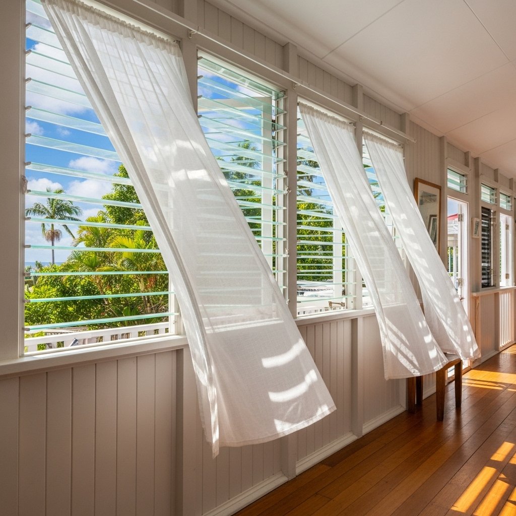 Lightweight curtains are essential for maintaining the airy feel of Queenslander homes. Fabrics like linen or cotton allow natural light to filter through while providing privacy. Neutral or soft-colored curtains blend seamlessly with the overall color palette. These window treatments also add a touch of softness to the interior. They help create a relaxed and comfortable atmosphere.