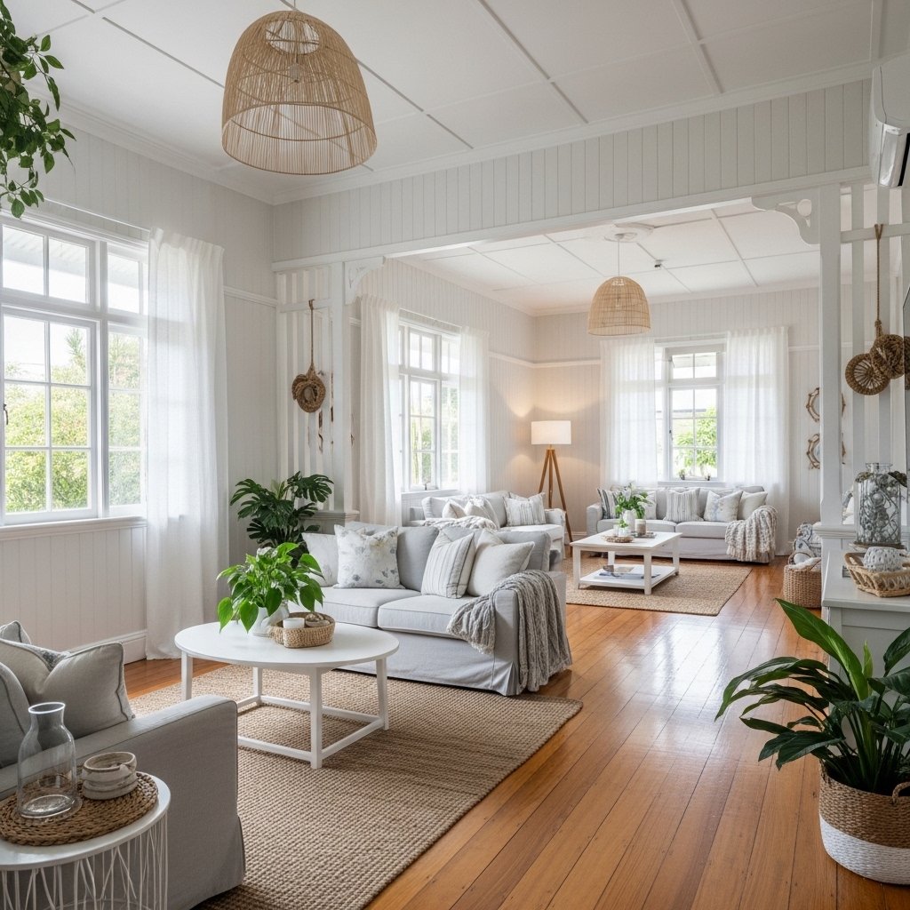Queenslander homes often incorporate coastal or tropical decor to reflect their surroundings. Elements like woven baskets, light fabrics, and ocean-inspired accents enhance the theme. Soft blues, greens, and sandy tones can be used to complement the neutral base. These details create a relaxed, vacation-like feel within the home. This style perfectly balances comfort with visual appeal.