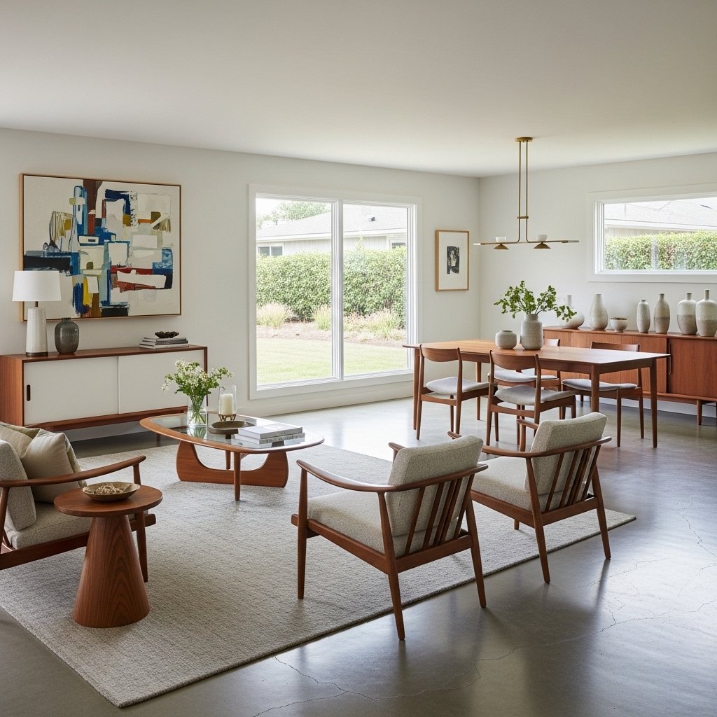Mid-century modern furniture pairs perfectly with ranch style homes due to its clean lines and functional design. Pieces with tapered legs, simple silhouettes, and minimal ornamentation work best. Sofas, chairs, and tables in neutral tones with subtle patterns enhance the aesthetic. This style keeps the space uncluttered while adding a touch of vintage charm. It’s a great way to balance modern living with classic ranch architecture.