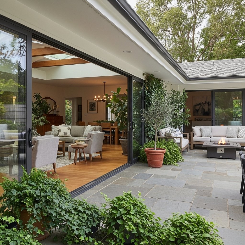 Ranch homes are designed to blend indoor and outdoor living seamlessly. Sliding glass doors or large openings leading to patios help create this connection. Use similar color schemes and materials both inside and outside to unify the spaces. Adding plants indoors can further enhance the natural feel. This design approach creates a relaxed and harmonious living environment.