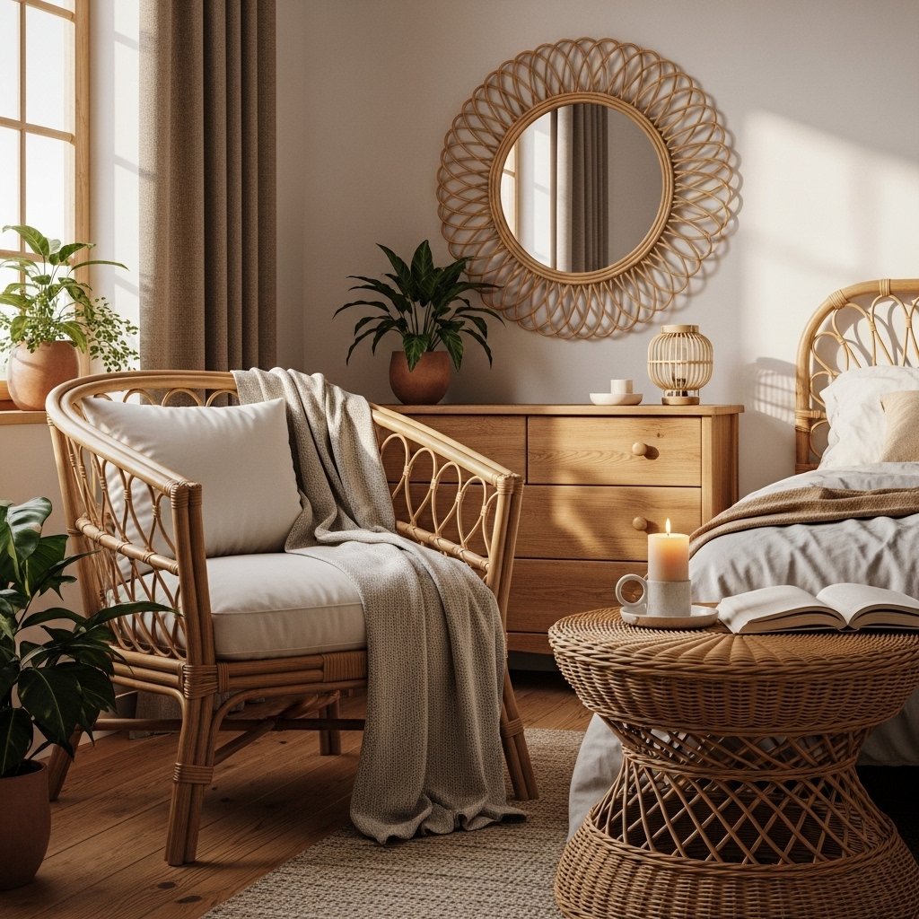Rattan and wicker furniture instantly add warmth to a boho space. Chairs, side tables, mirrors, or bed frames made from natural materials create a relaxed organic look. These textures pair perfectly with neutral tones and soft fabrics. Even a single rattan accent piece can transform the atmosphere of the room. It helps balance simplicity with stylish detail.