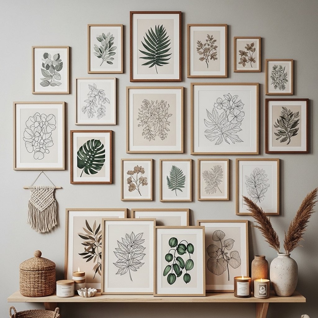 Boho wall art focuses on creativity and personal expression. Combine framed prints, line art, nature photography, and handmade pieces. Wooden frames or neutral borders keep the aesthetic balanced. A mixed gallery wall looks relaxed rather than perfectly symmetrical. This gives the room personality and a storytelling feel.