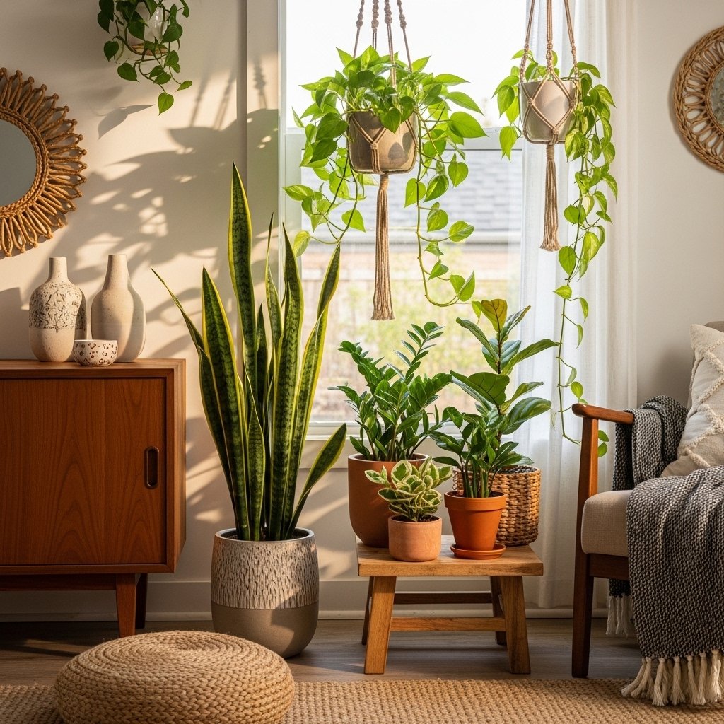 Plants soften retro interiors and balance bold colors beautifully. Popular choices include snake plants, pothos, and rubber plants placed in ceramic or clay pots. Hanging planters macrame style add a strong 70s inspired touch. Natural elements prevent the room from feeling too artificial or heavy. Greenery completes the cozy lived-in vintage atmosphere.