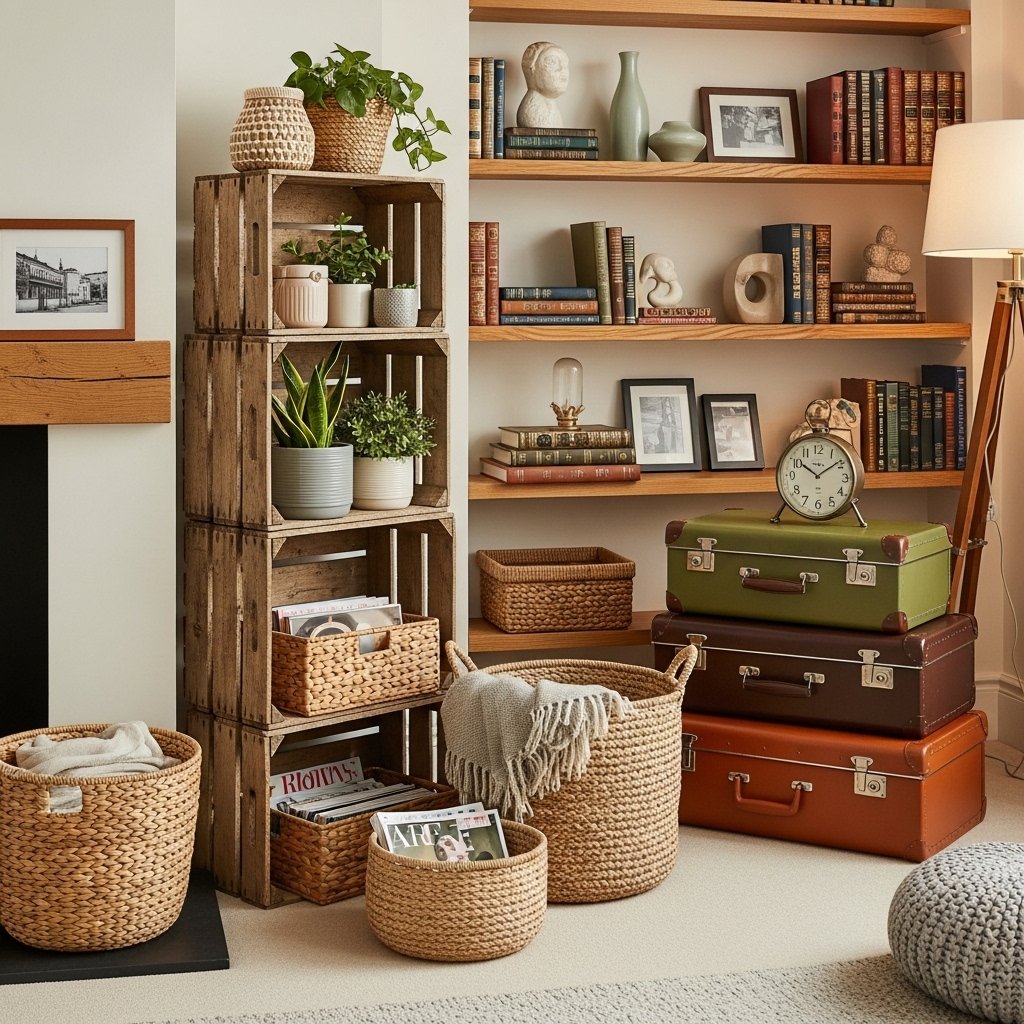 Storage can also become decorative in a retro aesthetic room. Use woven baskets, wooden crates, and vintage suitcases instead of plastic organizers. Open shelving displaying books and decor items feels more authentic than closed cabinets. This method keeps the room organized while maintaining style. Functional decor is key to achieving a practical vintage space.