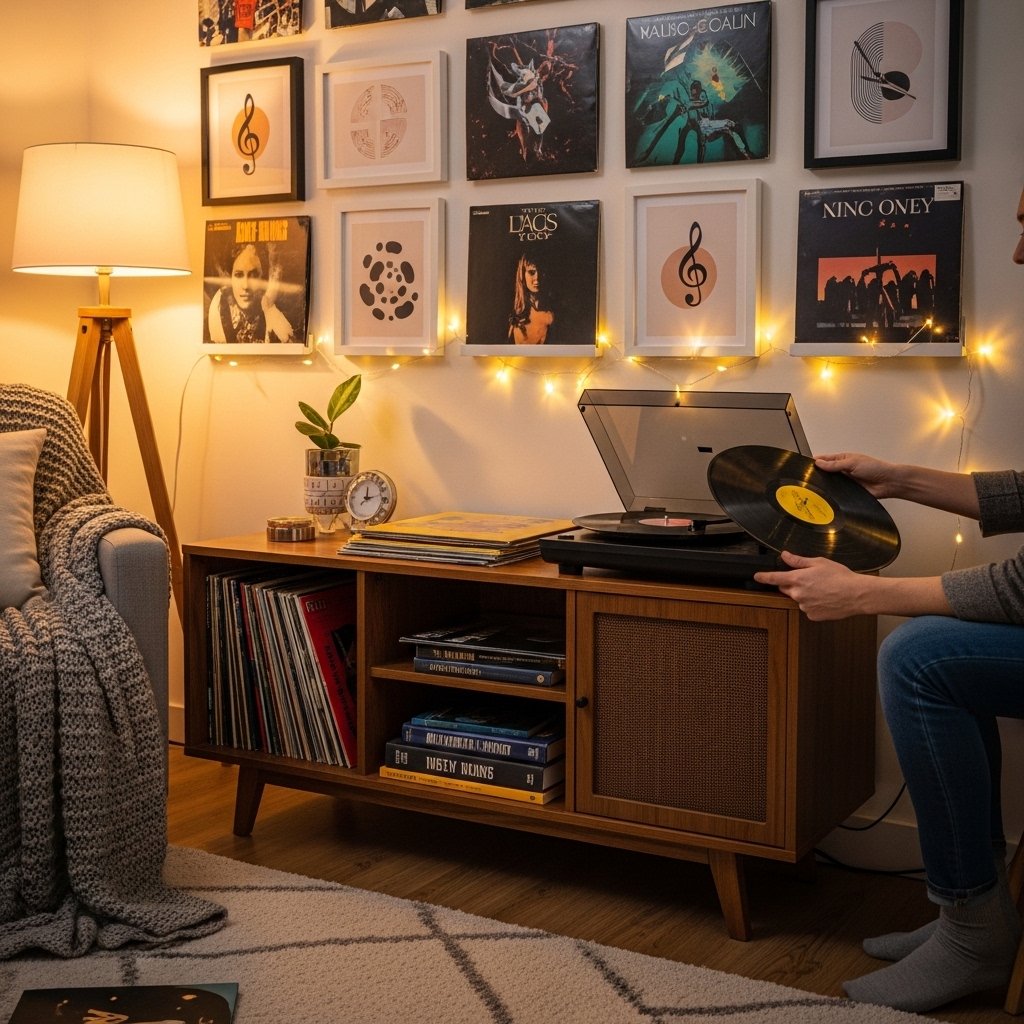 A vinyl listening corner is one of the most iconic retro room decor ideas. Placing a record player on a wooden stand with visible vinyl records creates instant vintage charm. Even if you don’t collect music, the aesthetic alone adds personality to the room. Stacking records vertically or displaying covers as wall art enhances the vibe. This area becomes both decorative and functional.