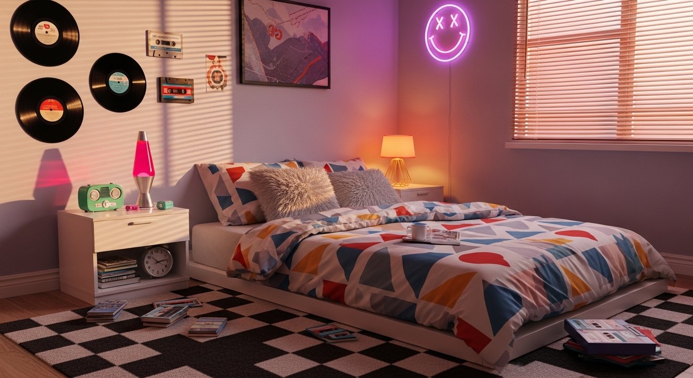 Lighting plays a major role in creating a retro atmosphere because vintage spaces rely on warm glowing tones. Neon signs shaped like hearts, stars, or phrases add a nostalgic diner-style aesthetic. Warm LED strip lights behind shelves or beds mimic 80s bedroom vibes beautifully. Soft ambient lighting makes the room cozy instead of harsh or modern. Combining multiple light sources helps create depth and character in the decor.