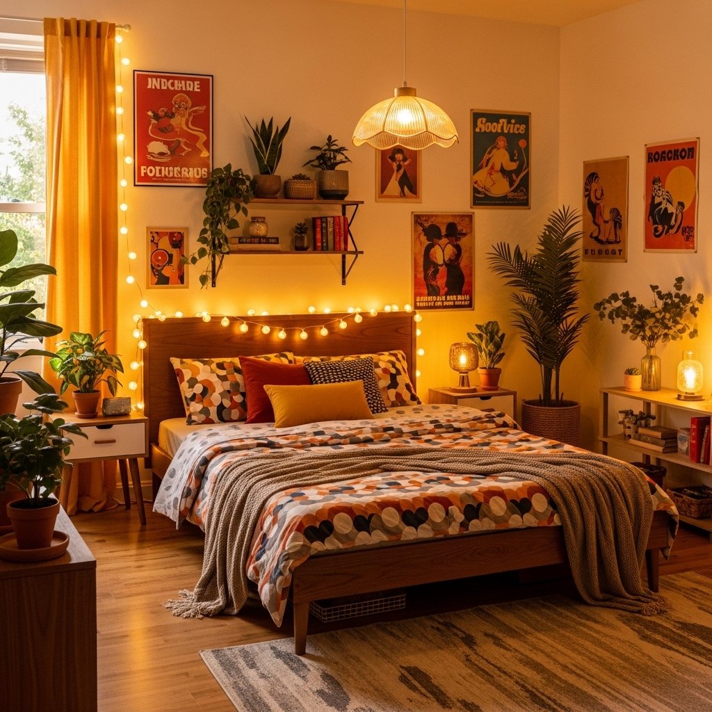 Retro aesthetic bedding introduces pattern and color without requiring permanent changes. Look for floral prints, geometric shapes, checkerboard designs, and warm toned quilts. Layering blankets and textured pillows adds comfort and visual depth. Materials like cotton and knitted throws help create that cozy vintage bedroom atmosphere. Bedding is one of the easiest ways to transform a plain room into a retro haven.