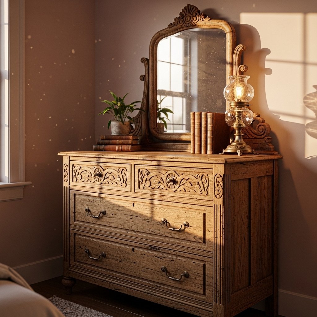 Antique wooden furniture instantly sets the foundation for a vintage aesthetic room. A distressed wooden dresser, carved nightstand, or aged vanity adds character and warmth to the space. Natural wood tones bring authenticity and balance against soft pastel walls. Even one statement piece can make a modern room feel nostalgic and inviting. Thrift stores and flea markets are great places to find affordable vintage-style furniture.