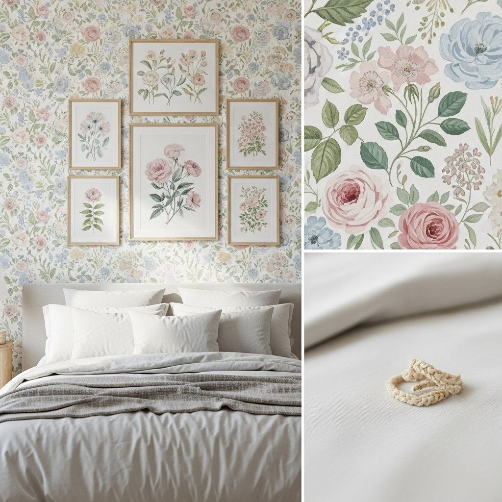Floral wallpaper is one of the most recognizable elements of vintage interior design. Soft roses, faded botanicals, and delicate patterns create a romantic atmosphere in any bedroom. If full wallpaper feels overwhelming, framed botanical prints or peel-and-stick panels work just as well. Light beige, cream, or dusty pink backgrounds enhance the aesthetic. This decor instantly transforms blank walls into a cozy vintage setting.