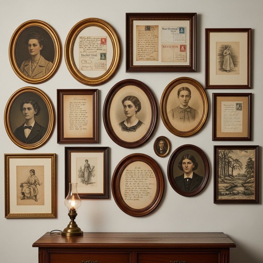 A vintage gallery wall adds personality and storytelling to your room decor. Mix ornate gold frames, oval frames, and wooden borders for an authentic collected-over-time look. Fill them with old photographs, art prints, postcards, or poetry pages. Slightly mismatched arrangements actually enhance the vintage aesthetic instead of ruining it. This idea works perfectly above beds, desks, or dressers.