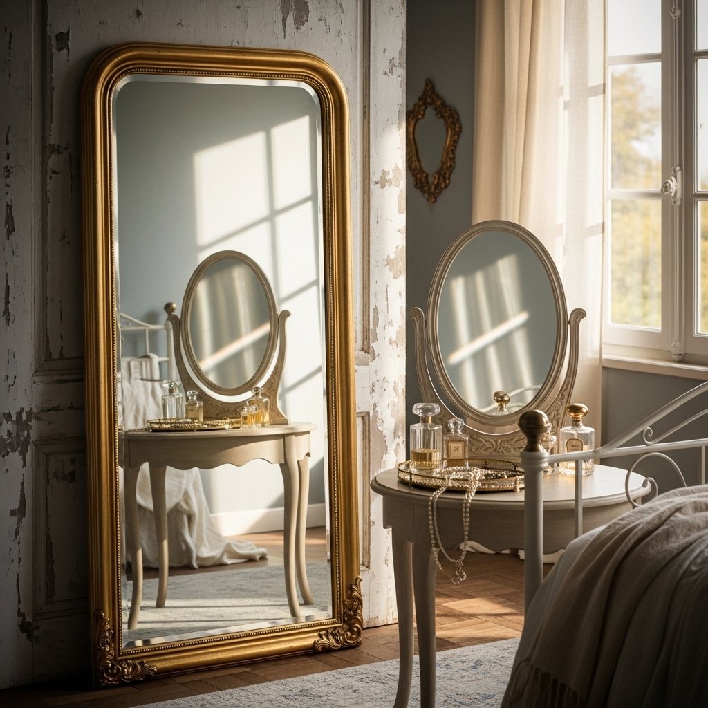 Vintage mirrors add light, depth, and elegance to aesthetic room decor. Ornate gold or bronze mirrors work best for achieving an antique feel. Leaning a tall mirror against the wall creates a soft European vintage vibe. Smaller decorative mirrors can be arranged above vanities or dressers. They make the room feel brighter while maintaining nostalgic charm.