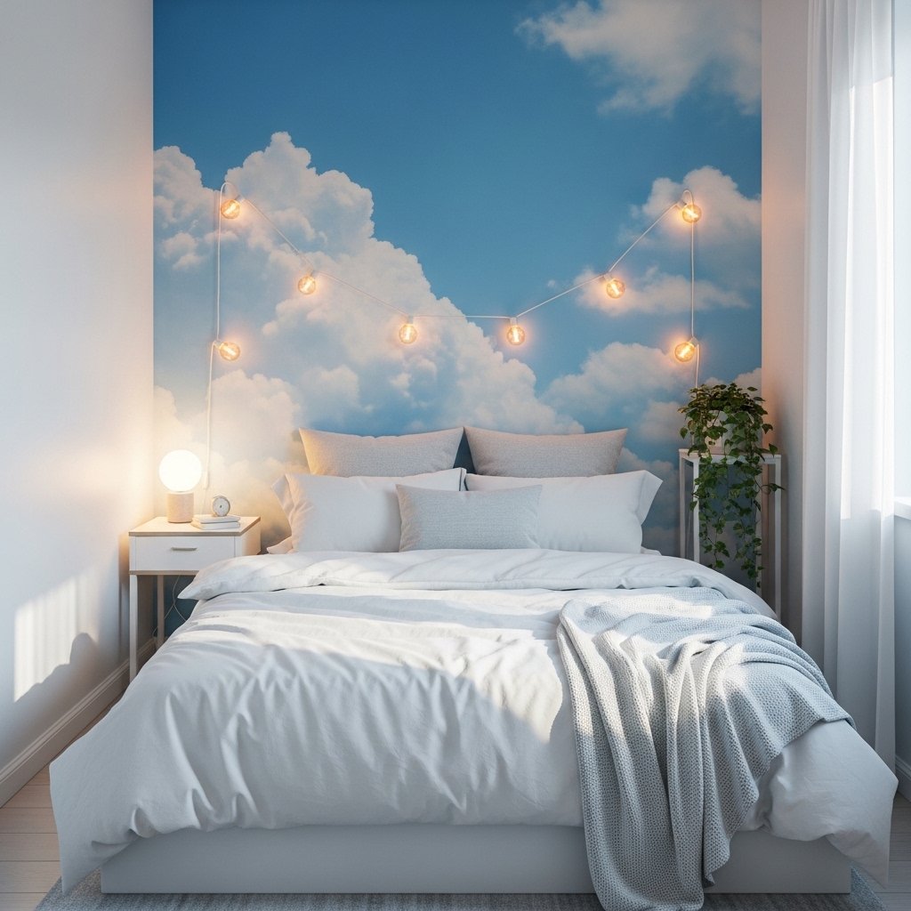 Sky and cloud wallpaper creates a dreamy and peaceful atmosphere. Soft blue tones help the room feel open and calming. This style works especially well in small rooms to create visual spaciousness. Pairing it with white bedding and warm lights enhances the cozy effect. The overall aesthetic feels soft, airy, and comforting.