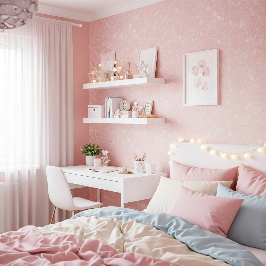 Soft pastel aesthetic wallpaper adds a gentle and cozy mood to any bedroom or study area. Colors like blush pink, sage green, baby blue, and lavender create a relaxing environment. This style is popular in aesthetic girl rooms because it feels dreamy yet organized. Pairing pastel wallpaper with white furniture enhances brightness without overwhelming the space. It’s a perfect choice for anyone who enjoys calm, soft interior styling.