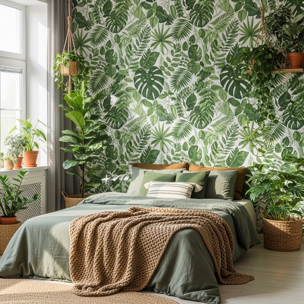Botanical wallpaper adds freshness and natural energy into interior spaces. Leaf prints, vines, and soft greenery patterns make the room feel calm and refreshing. This design works especially well in bedrooms where relaxation is important. Combining it with plants enhances the organic aesthetic beautifully. Nature wallpapers help bring an outdoor feeling indoors effortlessly.