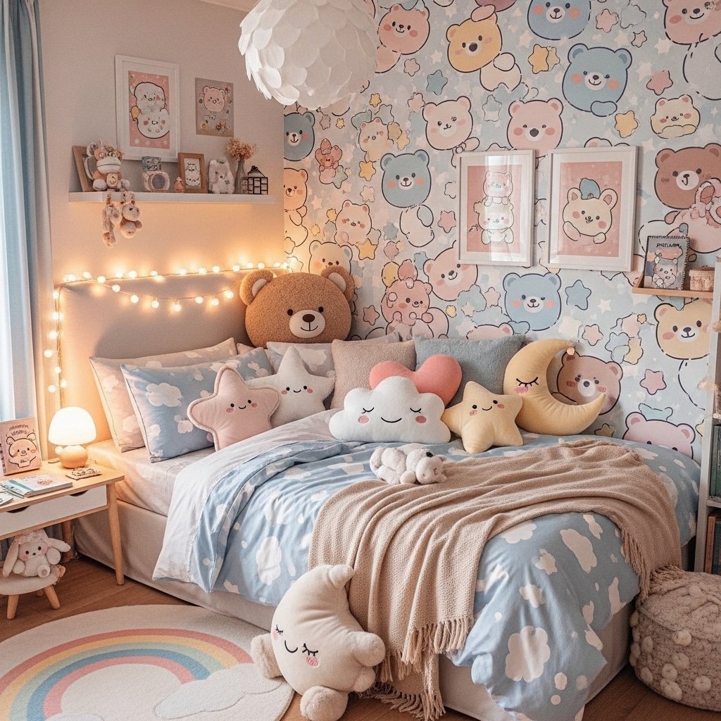 Cute cartoon wallpaper adds playful charm and personality to the space. Designs featuring bears, clouds, stars, or minimal characters are especially popular online. This aesthetic works beautifully in kids’ rooms and cozy creative spaces. Pairing it with soft bedding and plush textures enhances the comfort level. The overall look feels cheerful yet aesthetically pleasing.