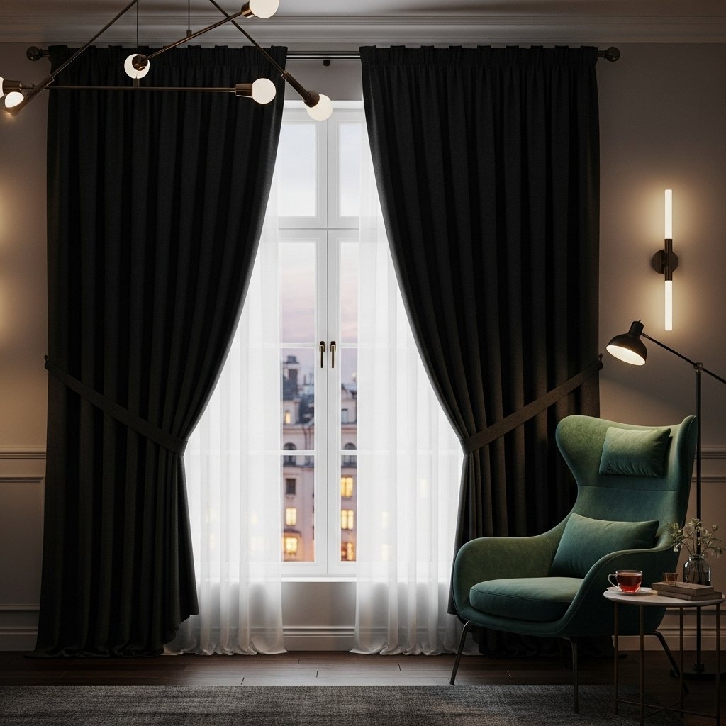 Black curtains enhance the moody and luxurious feel of an aesthetic black bedroom. They provide excellent light control and privacy, making them ideal for restful sleep. Choose flowing fabrics like velvet or linen for a soft, elegant look. Pair them with sheer white curtains if you want adjustable brightness. Curtains complete the overall aesthetic while adding function and style.