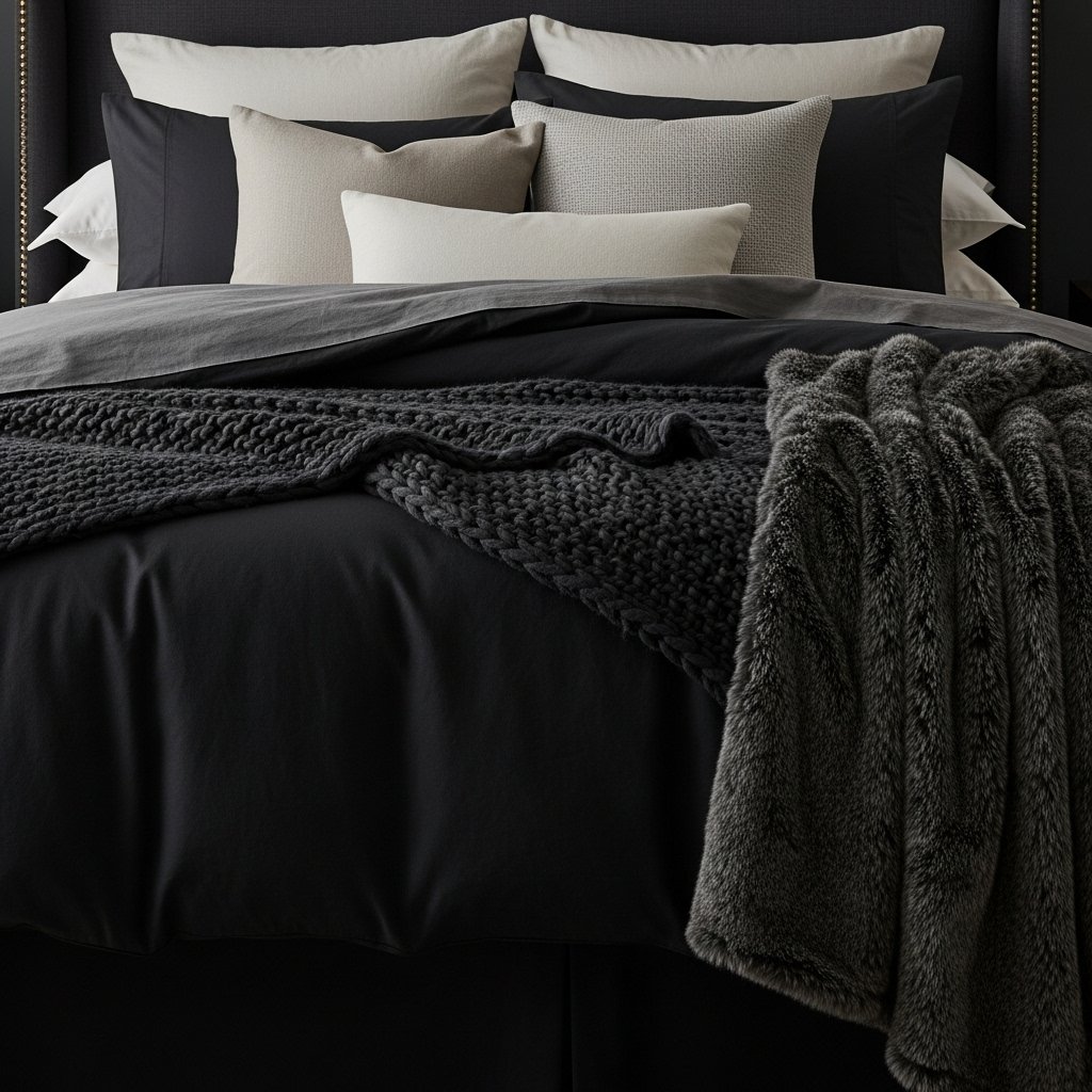 Black bedding creates a luxurious and cozy vibe that feels both modern and intimate. To avoid a flat look, layer different textures like cotton sheets, velvet duvets, and knit throws. Mixing shades of black, charcoal, and dark gray adds dimension and warmth. Accent pillows in neutral or metallic tones soften the overall appearance. This approach keeps the bedroom stylish while maintaining comfort.