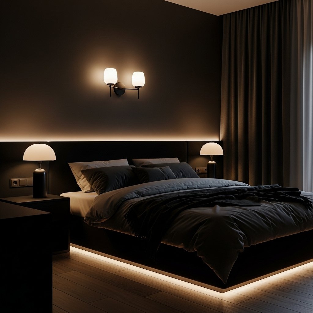 Lighting is essential in a black aesthetic bedroom to prevent the space from feeling too dark. Warm ambient lighting adds softness and enhances the richness of black décor. Table lamps, wall sconces, or LED strip lights create a cozy glow throughout the room. Avoid harsh white lights, as they can clash with the moody atmosphere. Proper lighting makes the black bedroom feel inviting and relaxing.