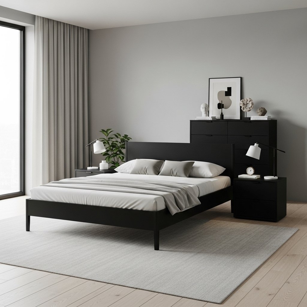 Black furniture with sleek, minimal designs enhances the modern aesthetic of the bedroom. Beds, dressers, or nightstands in black wood or matte finishes create a cohesive look. Choose furniture with slim legs or simple shapes to avoid visual clutter. Mixing black furniture with lighter flooring or rugs keeps the space balanced. This décor idea strengthens the black theme while maintaining an open feel.