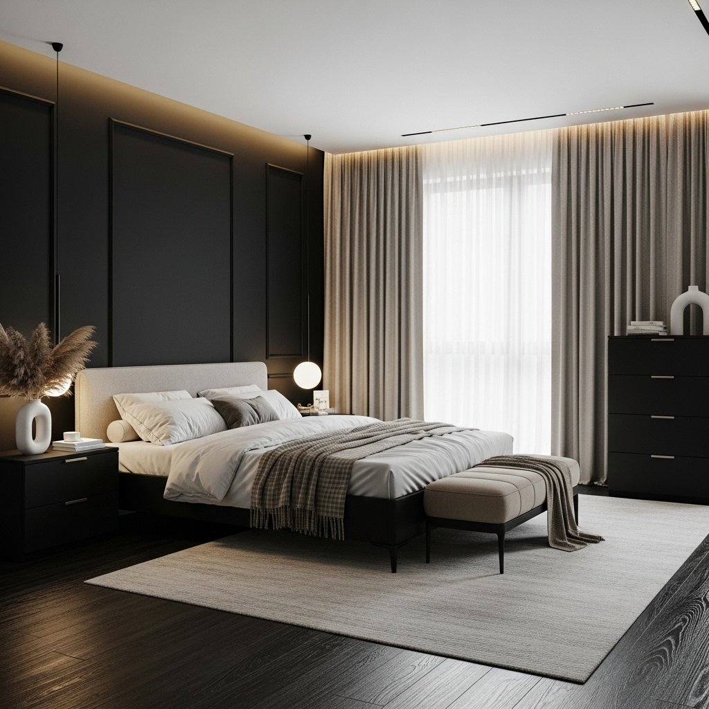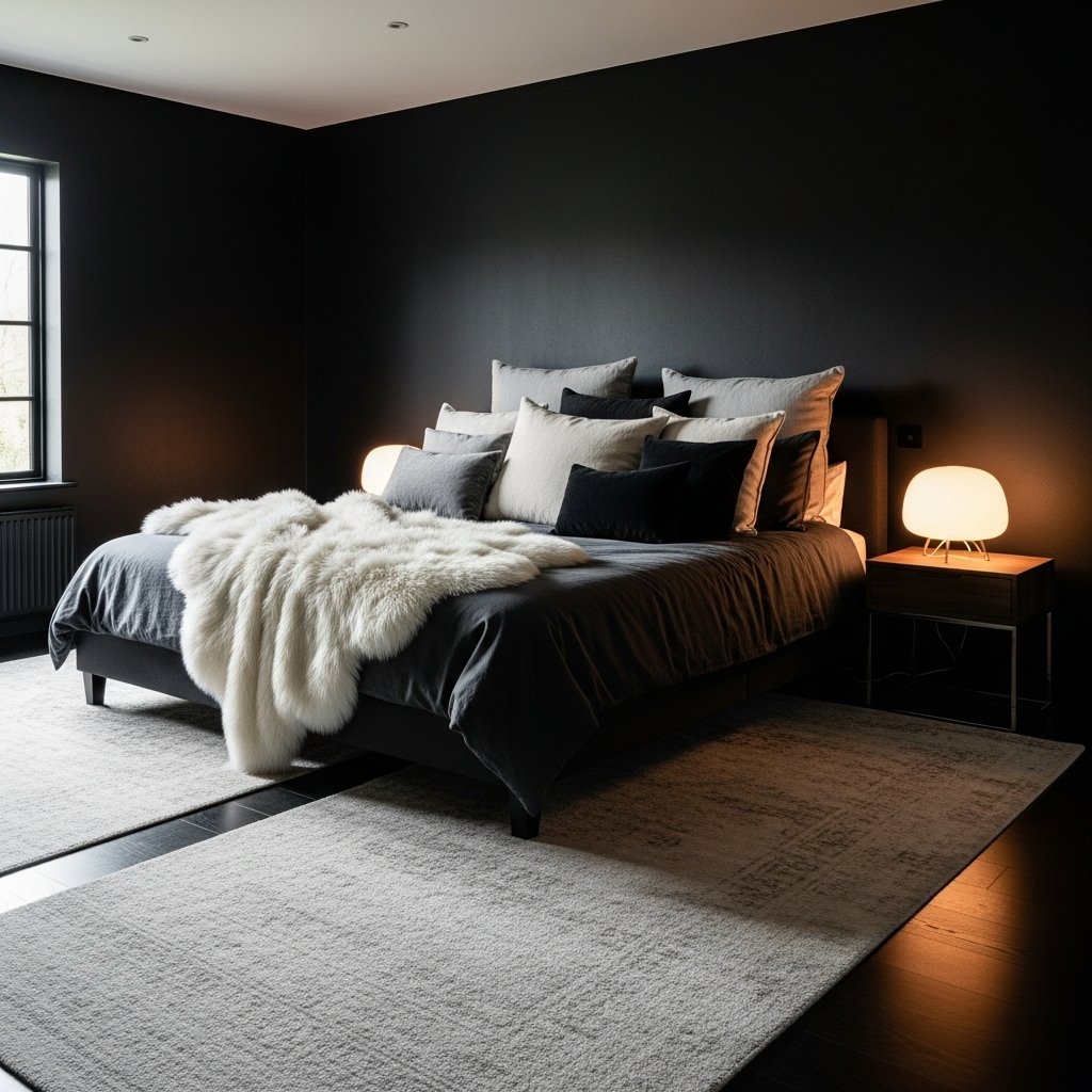 Soft textiles help balance the boldness of black décor by adding warmth and comfort. Rugs in neutral tones, faux fur throws, or plush cushions soften the room visually. These elements make the bedroom feel cozy rather than cold or harsh. Textiles also add layering, which enhances depth and interest. This combination creates a comfortable yet dramatic bedroom aesthetic.