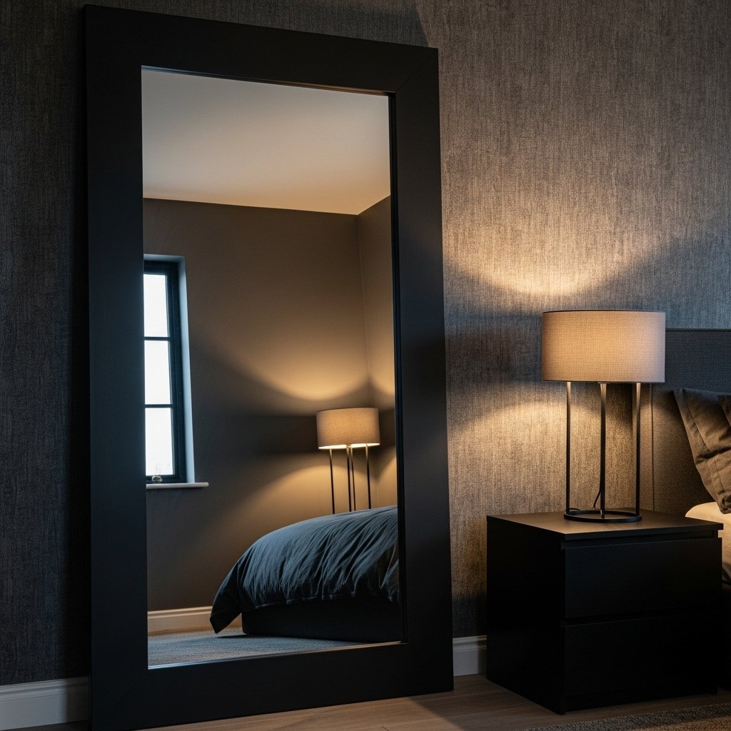 Mirrors are especially important in black-themed bedrooms to reflect light and prevent the room from feeling too enclosed. Large mirrors or mirrored furniture help open up the space visually. Black-framed mirrors maintain the aesthetic while adding elegance. Placing mirrors near light sources enhances brightness naturally. This décor trick keeps the bedroom feeling spacious and stylish.