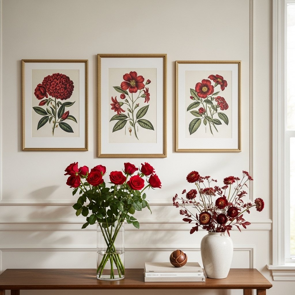 Floral décor introduces softness and freshness into a red-themed bedroom. Red roses, dried flowers, or botanical prints add a romantic and aesthetic vibe. You can also use artificial plants with red-toned leaves for a modern look. Pair greenery with red elements for contrast and balance. This approach brings life and vibrancy into the room.
