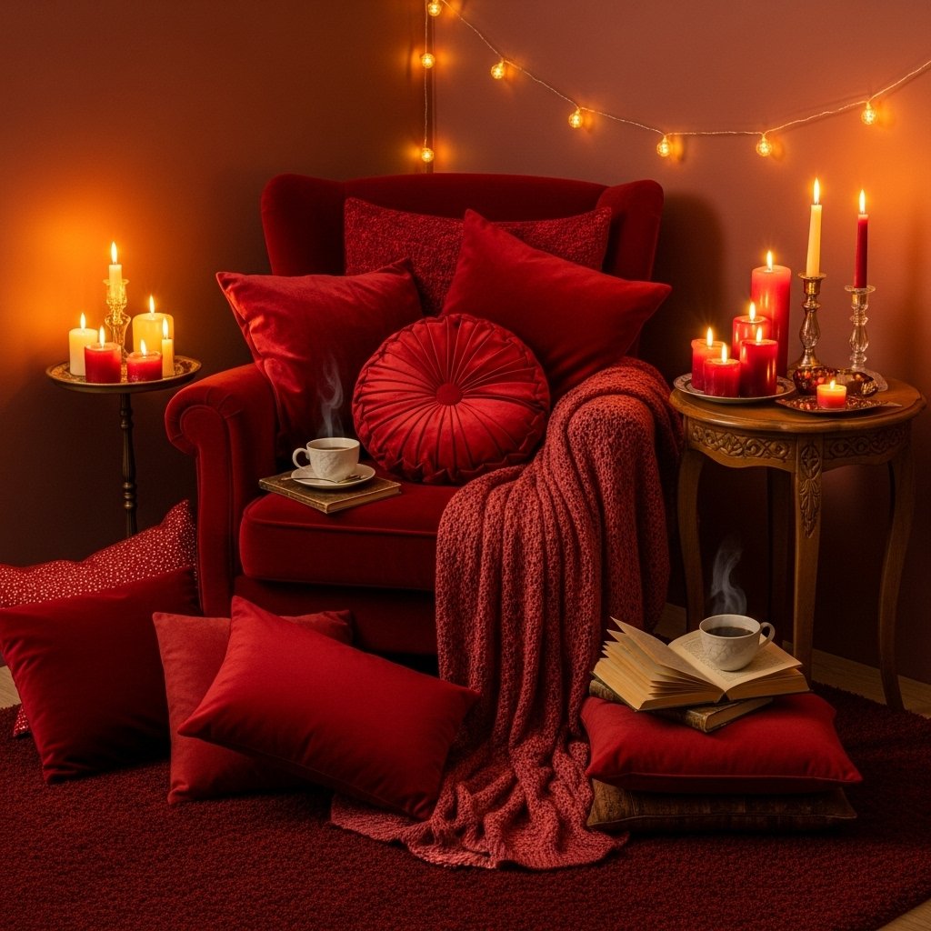 Designating a small romantic corner enhances the bedroom’s aesthetic appeal. A cozy chair, red cushions, soft lighting, and candles create an intimate nook. This space can be used for reading, relaxing, or unwinding at night. Keeping the décor minimal maintains balance and calmness. A romantic corner adds charm and functionality to the bedroom.