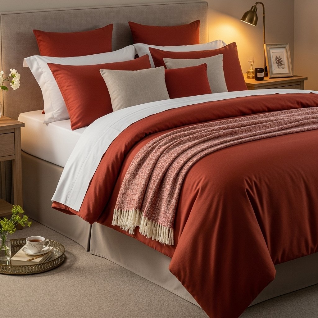 Red bedding is one of the easiest ways to introduce color into your bedroom décor. Soft crimson, rust, or muted rose tones create warmth while keeping the look elegant and inviting. Layering red comforters with white or beige sheets adds contrast and softness. Textured fabrics like velvet or quilted cotton enhance the aesthetic feel. This approach allows you to embrace red without committing to permanent changes.